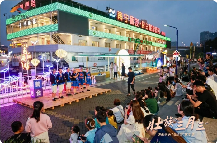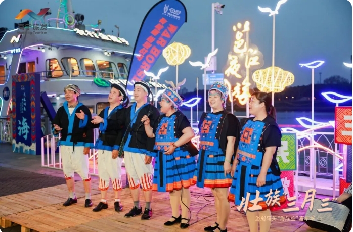“三月三”假期,南寧旅發(fā)公司在民生旅游碼頭邕江夜游現(xiàn)場(chǎng)開展對(duì)唱山歌活動(dòng),身穿民族服裝的阿哥阿姐們與現(xiàn)場(chǎng)的市民游客對(duì)唱山歌,以歌會(huì)友,表達(dá)節(jié)日的祝福,大家在歡聲笑語中共同感受廣西“三月三”特色文化的魅力。