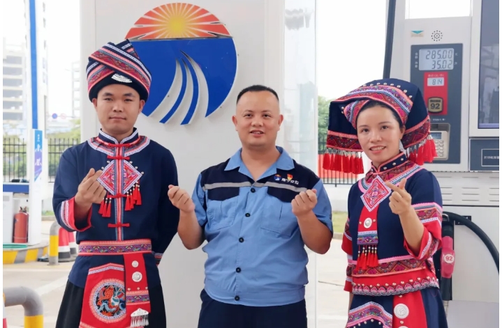 在貴義加油站,員工們穿上壯族傳統(tǒng)服飾為客戶服務(wù),開展“三月三”民俗知識(shí)趣味問答,送上寓意吉慶瑞祥的繡球工藝品,與過往司乘開心互動(dòng)。